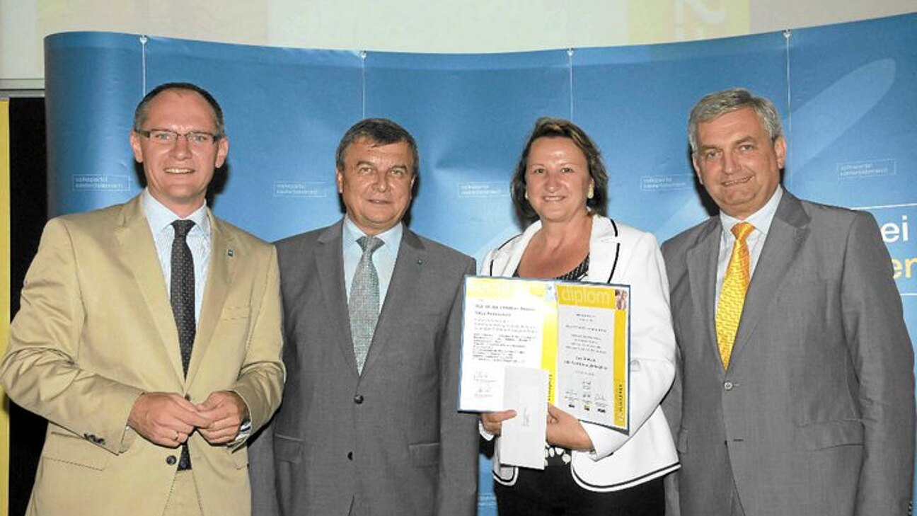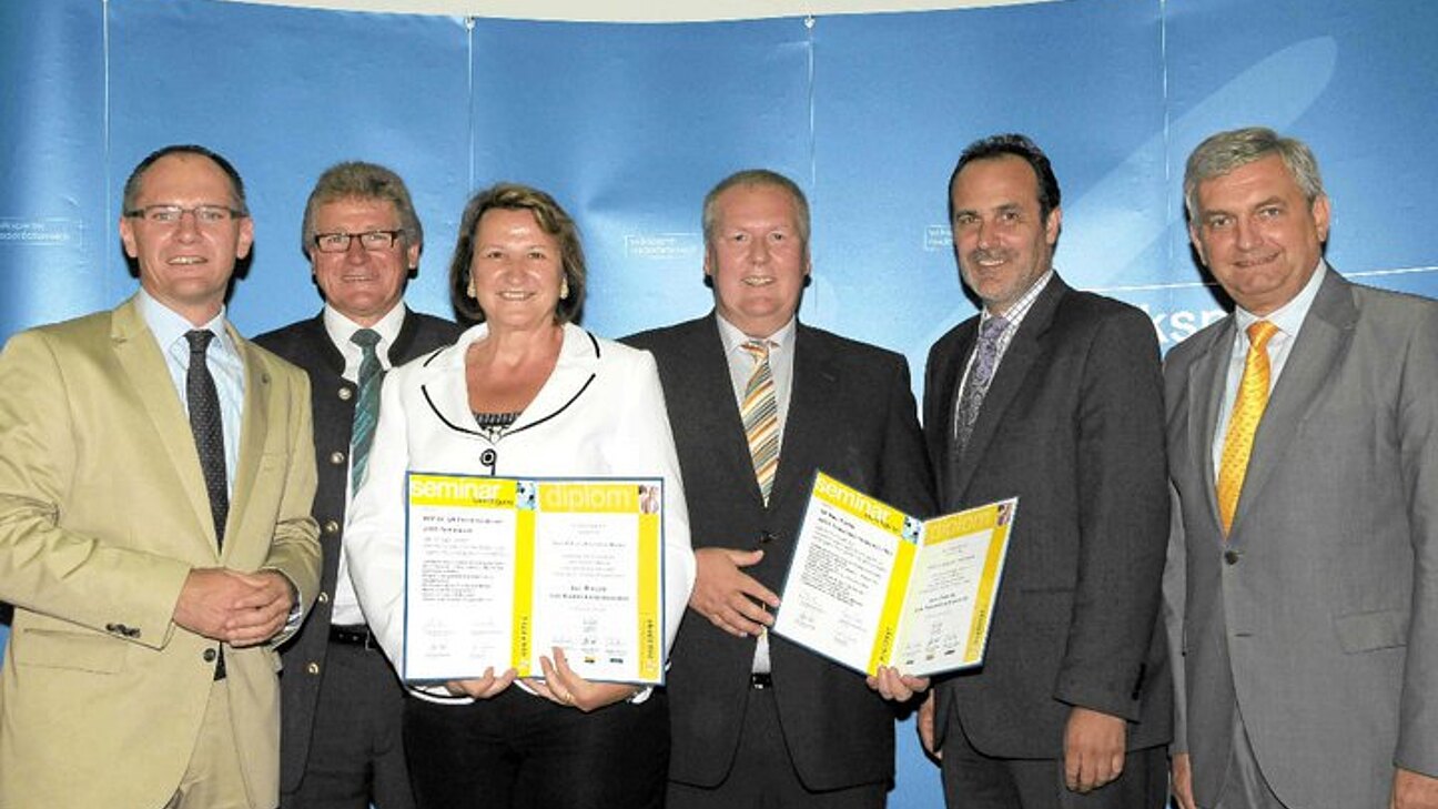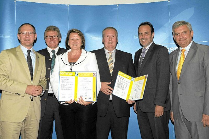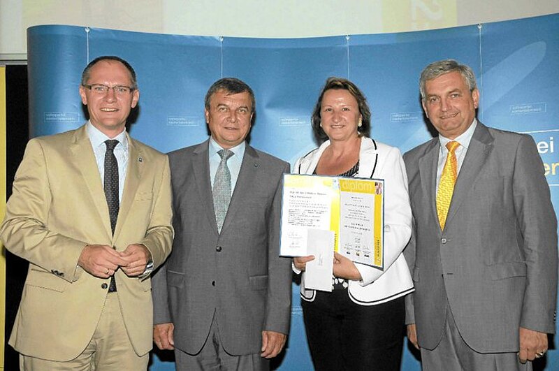 BGF, GPO u. GfGR Christine Besser aus Sommerein sowie GR Paul Fuchs aus Trautmannsdorf nahmen in Anwesenheit von Landesgeschäftsführer Gerhard Karner, OPO Hermann Maurer, Bgm. Heinz-Christian Berthold sowie dem Präsidenten des Gemeindevertreterverbandes, LAbg. Mag Alfred Riedl und LAbg. Ing. Johann Hofbauer vom NÖ Landtagsklub ihr Kommunalmanager-Diplom entgegen.