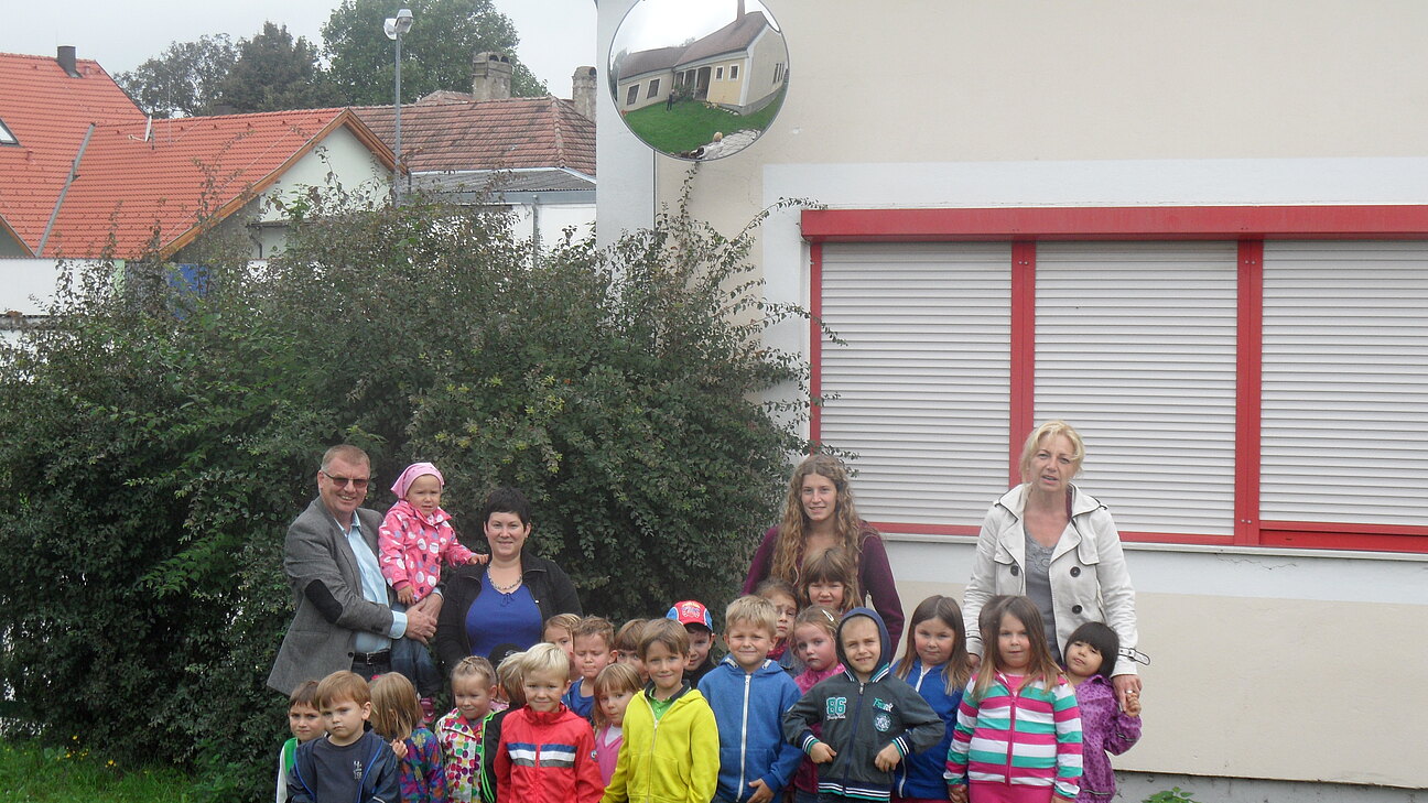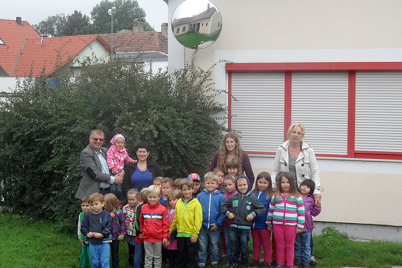 AKTION SCHUTZENGEL: Der Kindergarten in Au freut sich über die Montage eines "Sicherheitsspiegels" im Garten