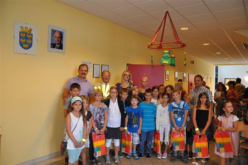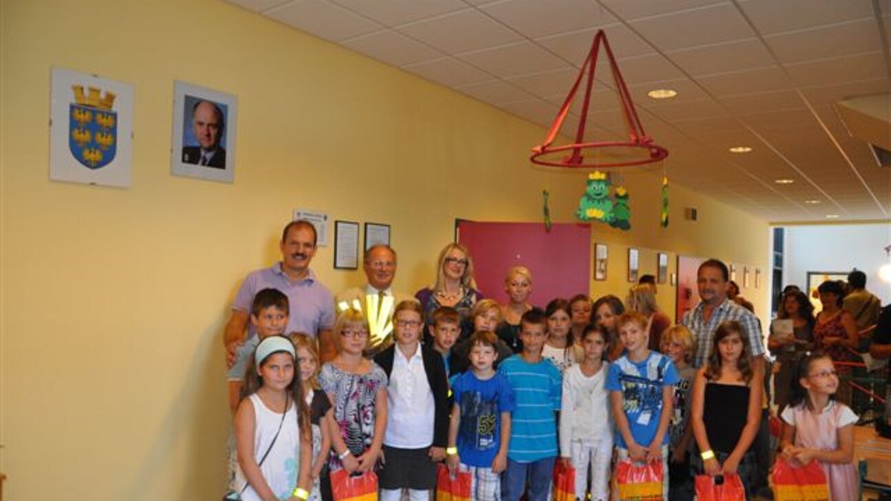 Im Rahmen der Aktion Schutzengel 2011 verteilten Bgm. LKR Otto Auer (Höflein) und Bgm. Hubert Zwickelstorfer (Scharndorf) am ersten Schultag an alle Kinder der Volkschule Höflein Klackarmbänder.