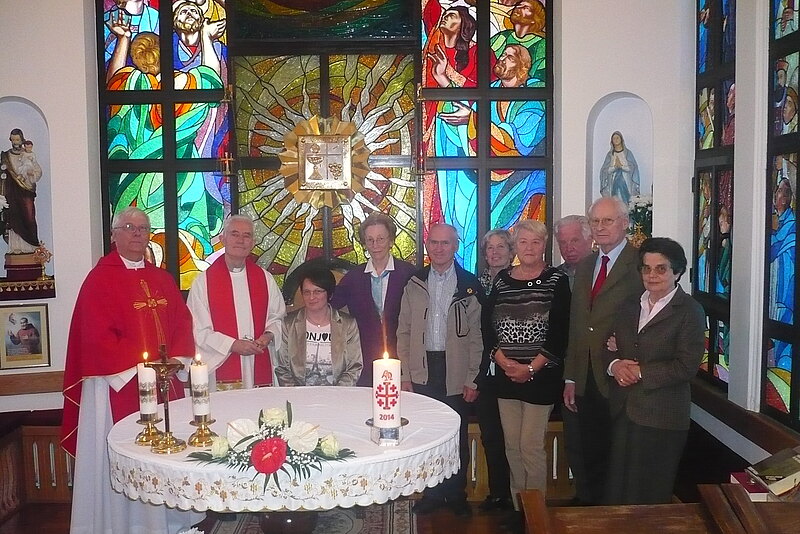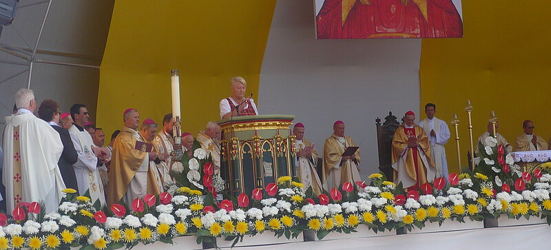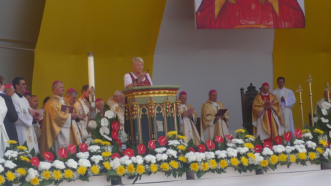 Am Samstag den 17. Mai fand im vollbesetzten Stadion von Jasi das große Ereignis statt. Brigitte Reiner-Schirmbrand durfte eine der Fürbitten lesen. Dafür hatte sie die N. Ö. Landestracht gewählt. Im Dirndl fiel sie natürlich auf. Und da geschah etwas Einmaliges: Sie wurde von verschiedenen Nationen aus der ganzen Welt euphorisch auf Bad Deutsch- Altenburg angesprochen. "Bitte dürfen wir ein Foto machen, da Sie aus dieser Ortschaft kommen, wo die Geburtskirche und das Taufbecken von unserem Märtyrer steht." In diesen Momenten hat sie zutiefst gespürt, wie Bischof Durkowitsch Bad Deutsch-Altenburg ,quasi auf einem Silberteller, der ganzen Welt präsentiert.