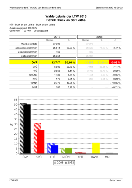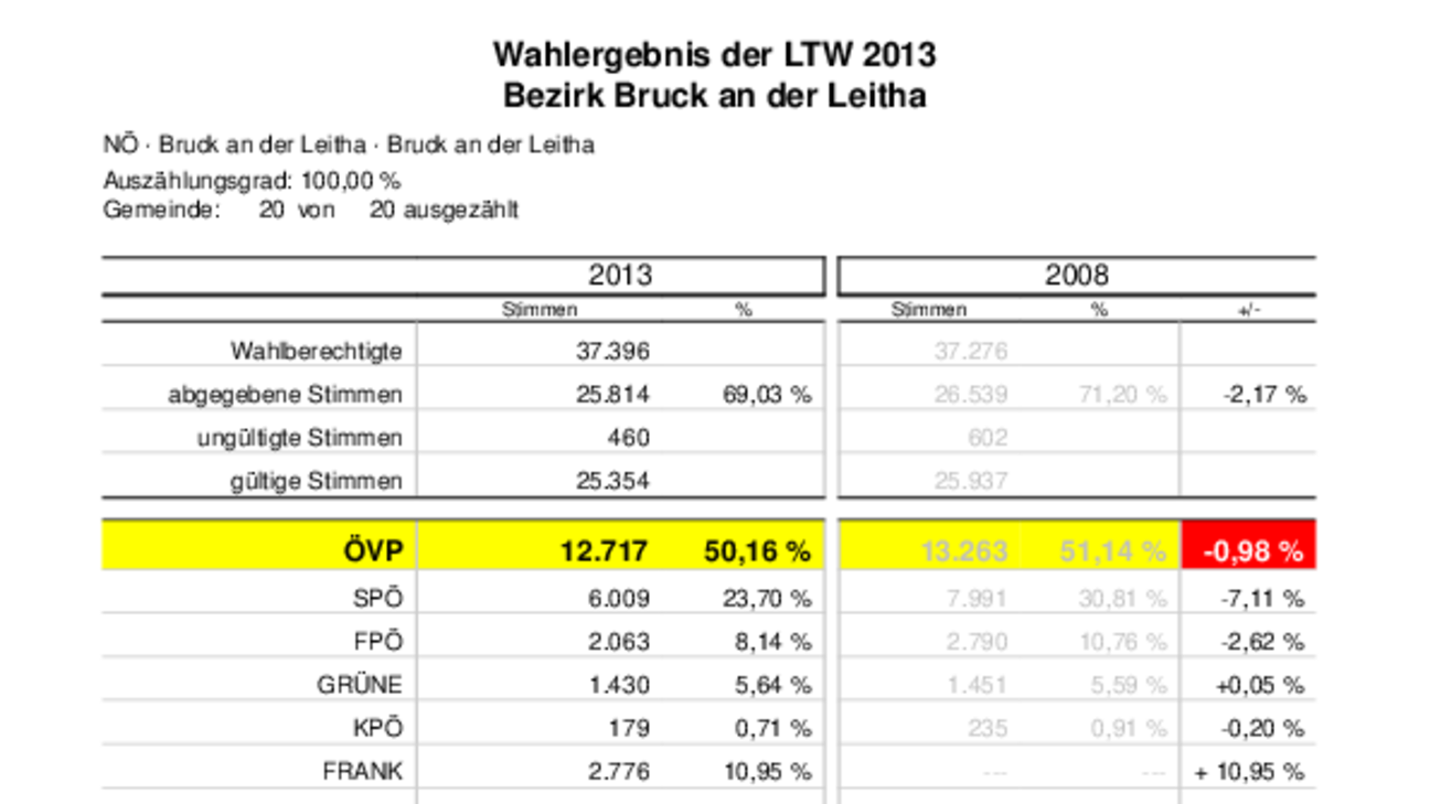 Das vorläufige Ergebnis der Landtagswahl steht fest. Im Bezirk Bruck an der Leitha behält die ÖVP mit 50,16% die absolute Mehrheit.