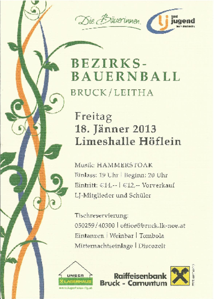 Am Freitag, den 18. Jänner 2013 findet in der Limeshalle in Höflein ab 20 Uhr wieder der Bezirksbauernball statt.
