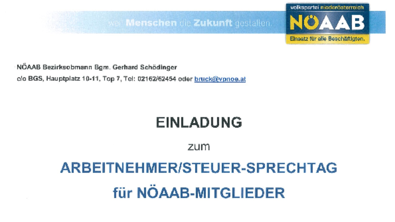 Anmeldungen zu diesem Steuer/Arbeitnehmerveranlagungs-Sprechtag nimmt ausschließlich die ÖVP-Bezirksgeschäftsstelle in Bruck unter der Tel Nr. 02162-62454 entgegen.