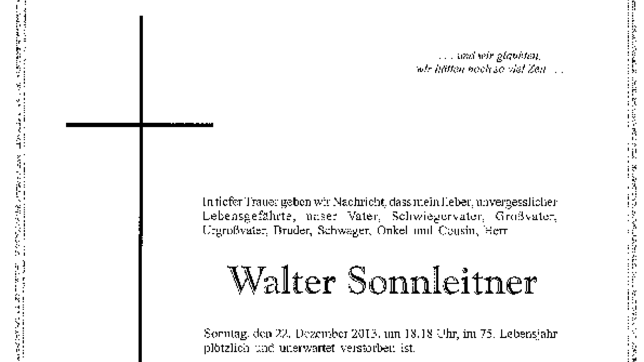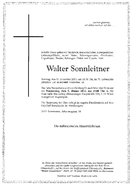 In tiefer Trauer informieren wir über den plötzlichen Tod unseres Ehrenbezirksobmannes der Senioren im Bezirk Bruck, Walter Sonnleitner, der am 22. Dezember 2013 im 75. Lebensjahr total unerwartet von uns gegangen ist.