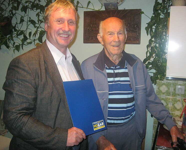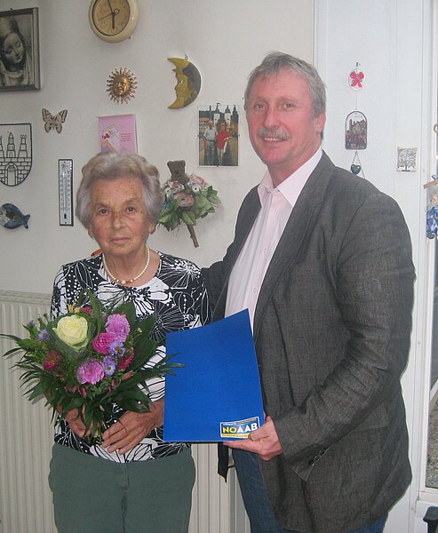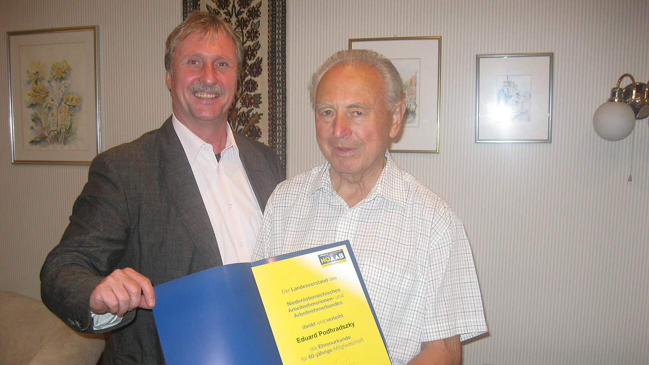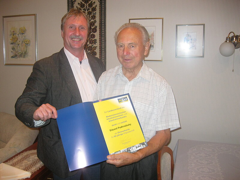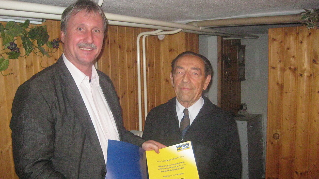 NÖAAB Bezirksobmann Bgm. Gerhard Schödinger und NÖAAB Stadtgruppenobmann Franz Wenzel besuchten langjährige Mitglieder, um diese mit einer Urkunde zu ehren.