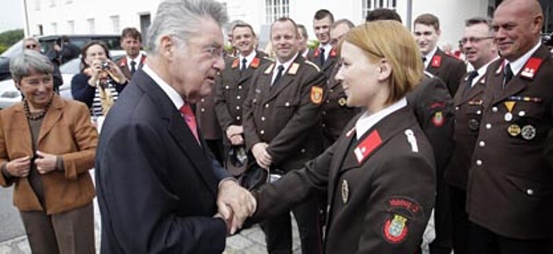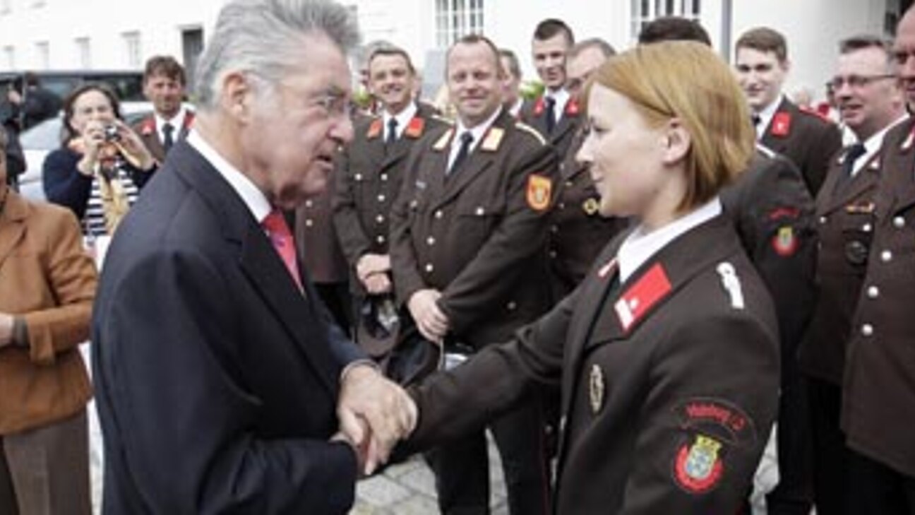 Ein Ehrenzug der Freiwilligen Feuerwehr empfing den Bundespräsidenten und Frau Margit Fischer in der Kulturfabrik.