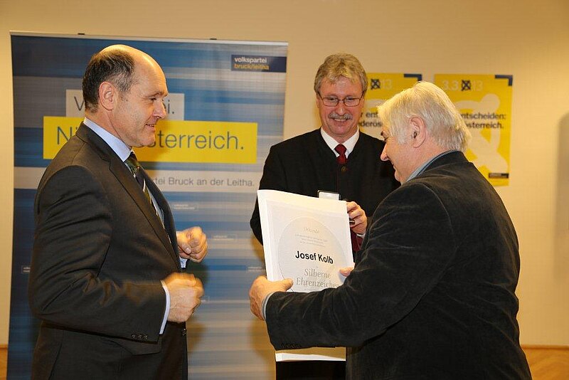 Herr Josef Kolb aus Mannersdorf erhielt vergangene Woche das Silberne Ehrenzeichen der VP Niederösterreich von LH Stvtr. Mag. Wolfgang Sobotka und Bezirksparteiobmann Gerhard Schödinger für seine langjährigen Verdienste (Bauernbundmitglied seit 1962, aktives SB-Mitglied) überreicht.