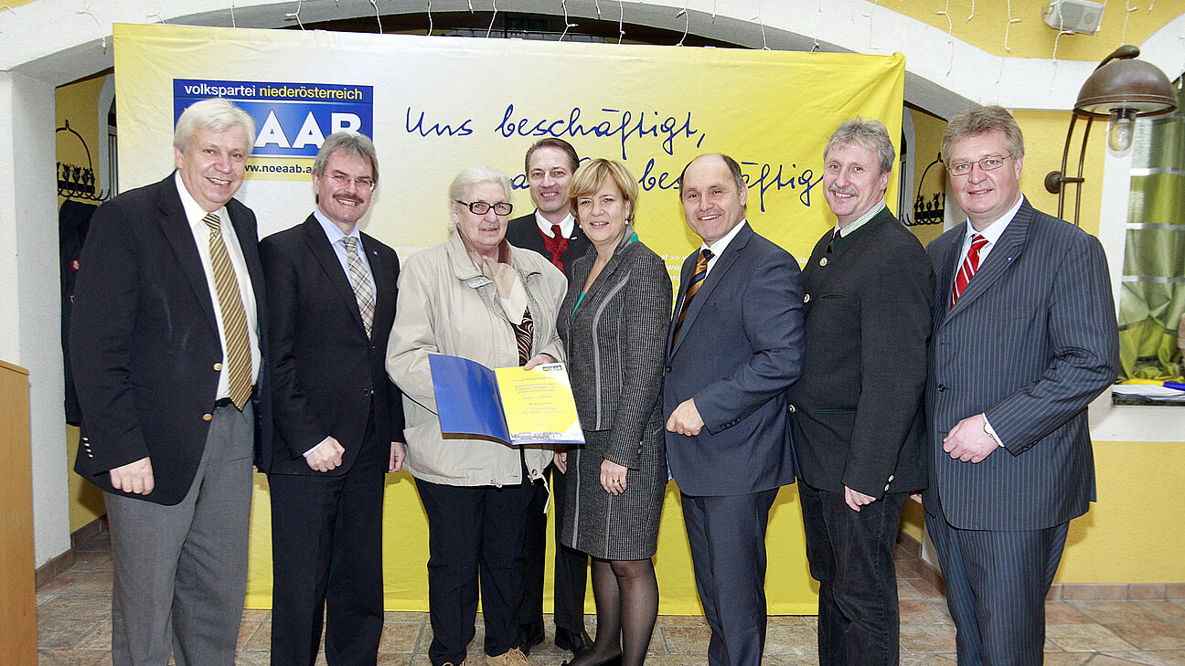 „Wir bitten Ältere vor den Vorhang und stellen ihre Verdienste ins Zentrum, damit wir ein Stück ihrer Einsatzfreude weiter geben, damit wir ihre Werte für die Zukunft bewahren“, betonte NÖAAB-Obmann LH-Stv. Wolfgang Sobotka bei der Übergabe der Ehrenzeichen für 60 und 65 jährige Mitgliedschaft. Mit Frau Rosa Lesch aus der Gemeinde Bad Deutsch Altenburg war auch ein Mitglied aus dem Bezirk bei der NÖAAB-Ehrungsfeier dabei. Frau Lesch ist 60 Jahre bereits NÖAAB-Mitglied. NÖAAB-Bezirksobmann Schödinger gratulierte: „Gerade in unserer schnelllebigen und allzu oft beliebigen Zeit brauchen wir Vorbilder wie unsere langjährigen Mitglieder und Funktionäre, die 60 Jahre und mehr in unserer Gesinnungsgemeinschaft mitarbeiten“. „Die ältere Generation kennt den Vergleich. Vor 60 Jahren war der Staatsvertrag noch nicht unterzeichnet. Der wirtschaftliche Aufschwung hatte noch nicht begonnen. Die Bedrohung aus dem Osten allgegenwärtig. Heute leben wir in einem Sozialstaat, verzeichnen Rekordbeschäftigung und leben in einem der sichersten Länder Europas. In den Erzählungen und Geschichten der Älteren spiegelt sich der Erfolgsweg unserer Landes wieder. Für ihre Leistungen können wir ihnen gar nicht genug danken“, betont NÖAAB-Bezirksobmann Gerhard Schödinger.