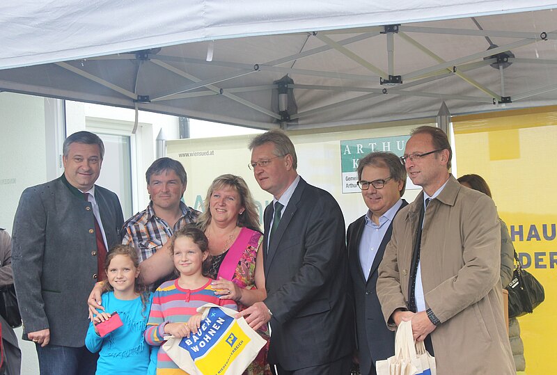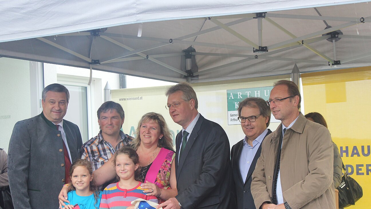 Enzersdorf: Bgm. Markus Plöchl übergibt Schlüssel für 14 Wohnungen und 4 Reihenhäuser