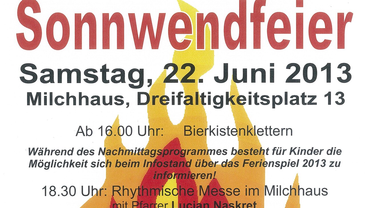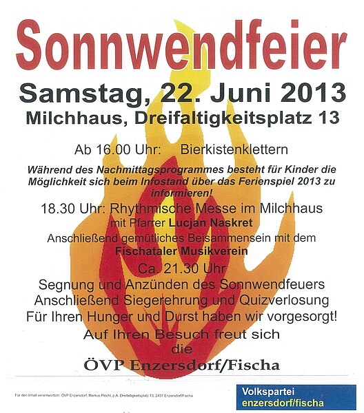 Am Samstag, den 22. Juni 2013 veranstaltet die Volkspartei Enzersdorf ab 16.00 Uhr eine Sonnwendfeier beim Milchhaus, Dreifaltigkeitsplatz 13.