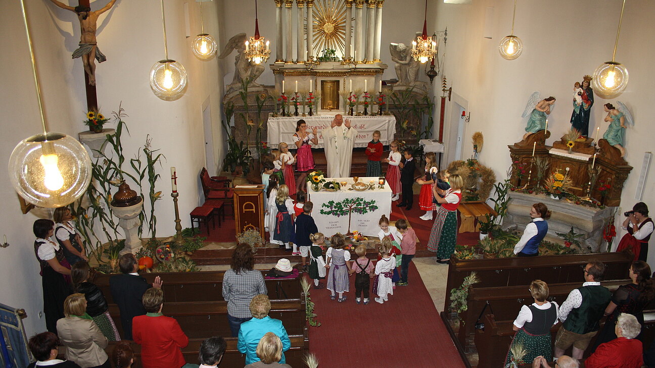 So freute es auch Pfarrer Pater Herbert Baumann, als er am Sonntag, 15. September 2013 eine große Anzahl von Mitfeiernden –groß und klein- aus der Pfarre und den umliegenden Gemeinden zum Erntedankfest in Sarasdorf beim Leitha-Kreuz begrüßen durfte. Bei herrlichem Herbstwetter wurde die Erntekrone gesegnet. Volksschulkinder brachten sich mit einem Lied ein. Den anschließenden Festzug führte traditionell der Musikverein Sarasdorf an, wo dann in der Kirche der Gottesdienst – gestaltet vom Kirchenchor unter der Leitung von Eva-Maria Sevcik-Lang gefeiert wurde. Wie schon seit einigen Jahren üblich, begeisterten im Anschluss daran am Kirchplatz diesmal Tänzerinnen und Tänzer der Volkstanzgruppe aus Mannersdorf. Als besondere Überraschung hatten die Volksschulkinder mit ihrer Religionslehrerin Elisabeth Kusolitsch und Herrn Ackerl in den letzten Tagen davor drei verschiedene Tänze einstudiert. Für die in Tracht gekleideten Mädchen und Buben war es eine besondere Freude, die Tänze den Mitfeiernden zum Besten zu geben. Für diese tolle Aufführung gab es natürlich Sonderapplaus. Inzwischen wurde alles für das Mittagessen vorbereitet, zu dem der Pfarrgemeinderat in das Feuerwehrhaus eingeladen hat. Den Frühschoppen gestaltete der Musikverein Sarasdorf. Ein herzliches Dankeschön an alle helfenden Hände, an die Mitwirkenden sowie Unterstützer und Gäste.