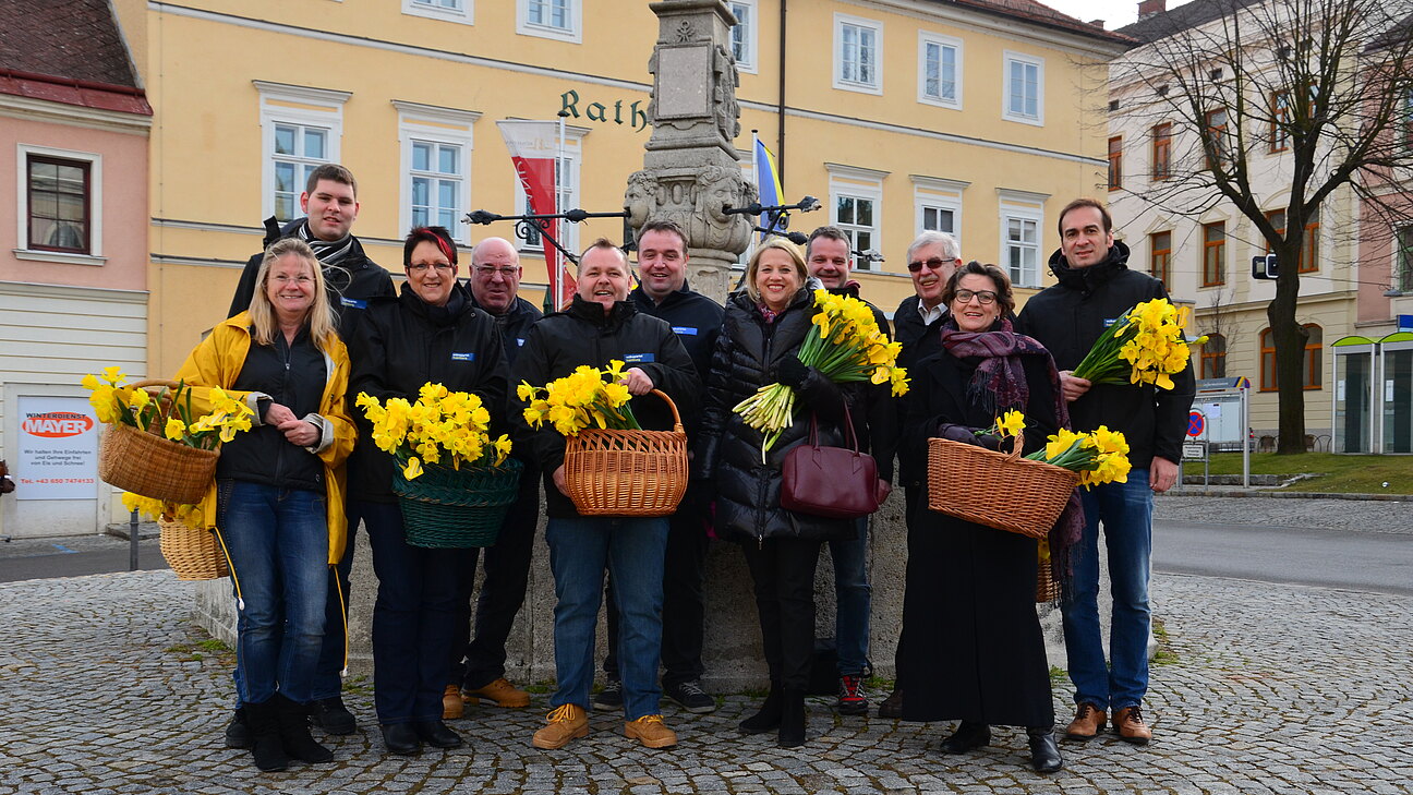 Das Team der VP-Stadtpartei Hainburg verteilte zum Valentin gelbe Narzissen an ihre Bürgerinnen und Bürger in der Mittelalterstadt.