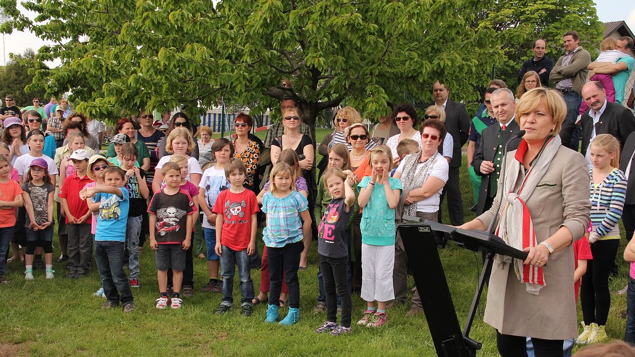 Bei herrlichem Wetter fand am Samstag, den 4.5.2013 die feierliche Eröffnung des Spielplatzes durch Frau Landesrätin Barbara Schwarz statt. Sie wies bei Ihrer Rede auf die große Bedeutung von Spielplätzen für die gesunde Entwicklung der Kinder hin.