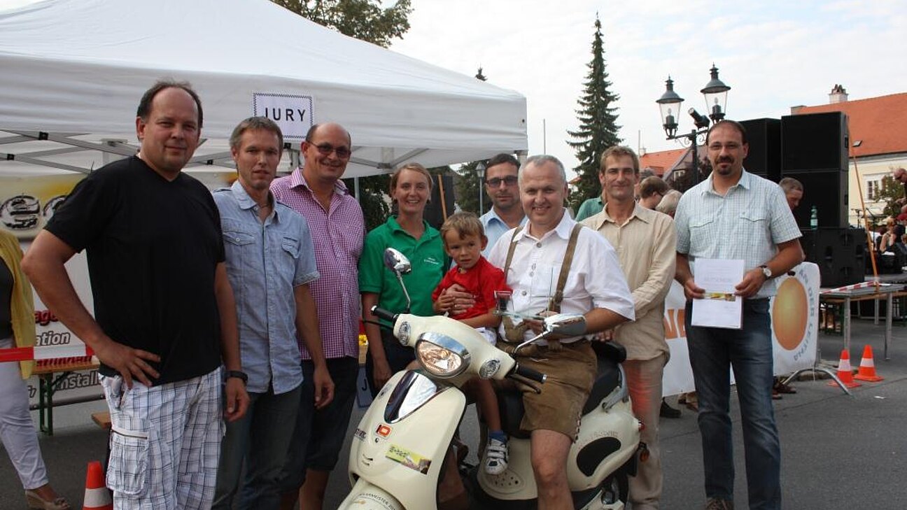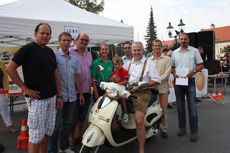 In der Rennpause des Akkuschrauberrennens konnten Göttlesbrunns Bürgermeister Franz Glock und der Energiebotschafter der Gemeinde Johann Taferner den eigens designten Pokal in Empfang nehmen. Als besondere Überraschung übergab Energieparkgeschäftsführerin Karin Mottl den beiden Gemeindevertretern außerdem die Schlüssel zu einem E-Scooter "als Anerkennung für die vorbildliche Nutzung der Kraft der Sonne für Wärme- und Stromgewinnung".