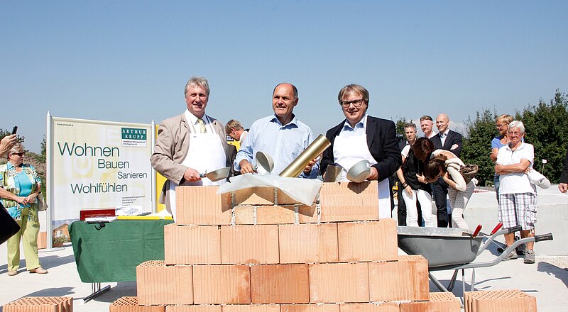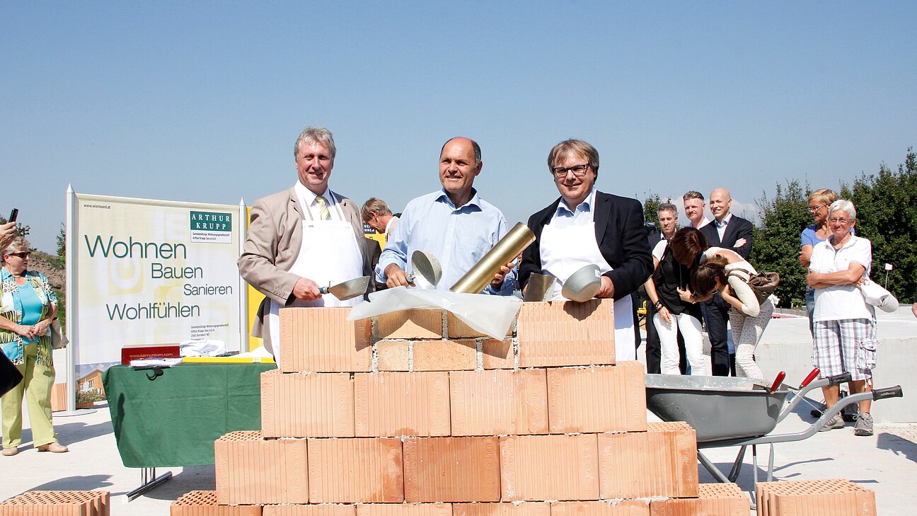 Anfang dieser Woche erfolgte die Grundsteinlegung für 16 Wohnungen am Sportplatzweg in Wolfsthal. VP-Bgm. Gerhard Schödinger, LH Stvtr. Wolfgang Sobotka sowie Friedrich Klocker von der gemeinnützigen Wohnungsgesellschaft Arthur Krupp setzten die ersten Steine für dieses Projekt.
