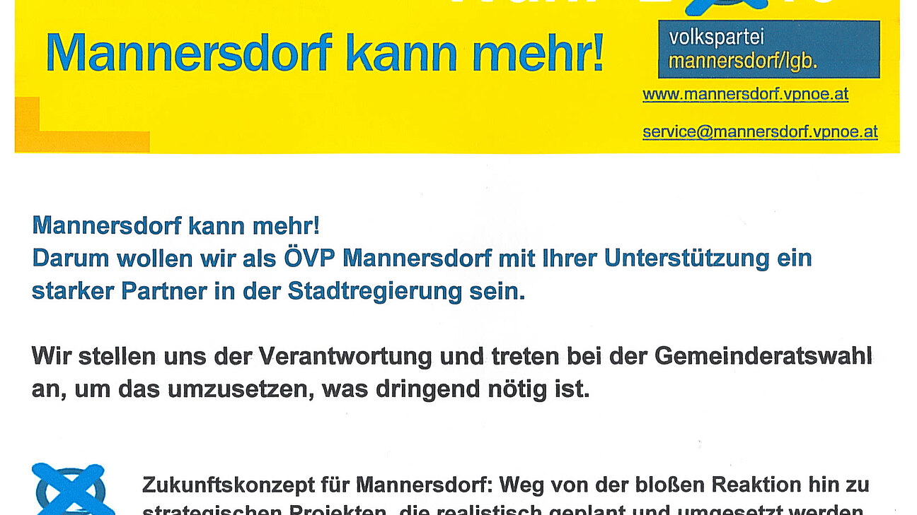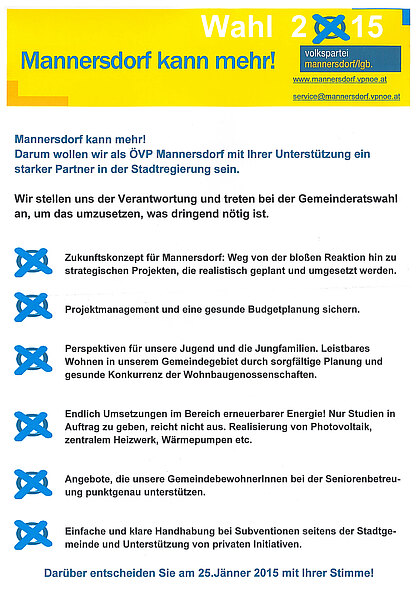 Am 8.1.2015 fand im Saal von Schloss Mannersdorf die Kandidatenpräsentation der VP Mannersdorf statt. Unter den Motto "Mannersdorf kann mehr!" stellte die Volkspartei ihre Ziele für die nächsten 5 Jahre vor: