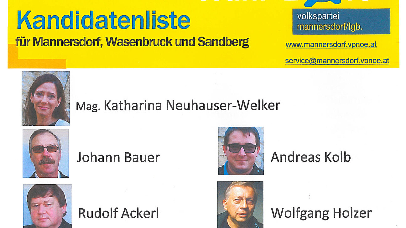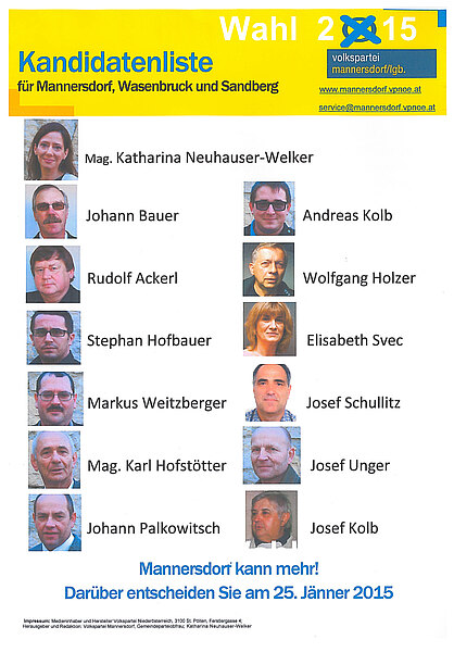 Folgende Kandidaten treten zur Gemeinderatswahl 2015 für Mannersdorf, Wasenbruck und Sandberg an: - Mag. Katharina Neuhauser-Welker - Johann Bauer - Andreas Kolb - Rudolf Ackerl - Wolfgang Holzer - Stephan Hofbauer - Elisabeth Svec - Markus Weitzberger - Josef Schullitz - Mag. Karl Hofstötter - Josef Unger - Johann Palkowitsch - Josef Kolb Darüber entscheiden Sie am 25.Jänner 2015 mit Ihrer Stimme!