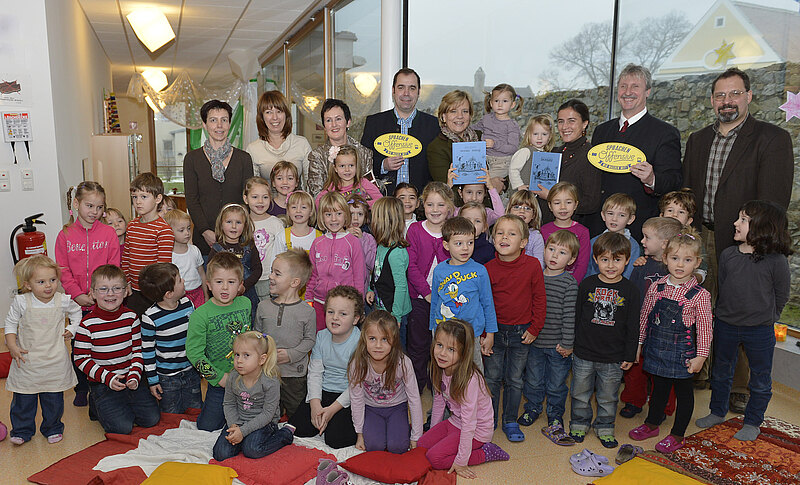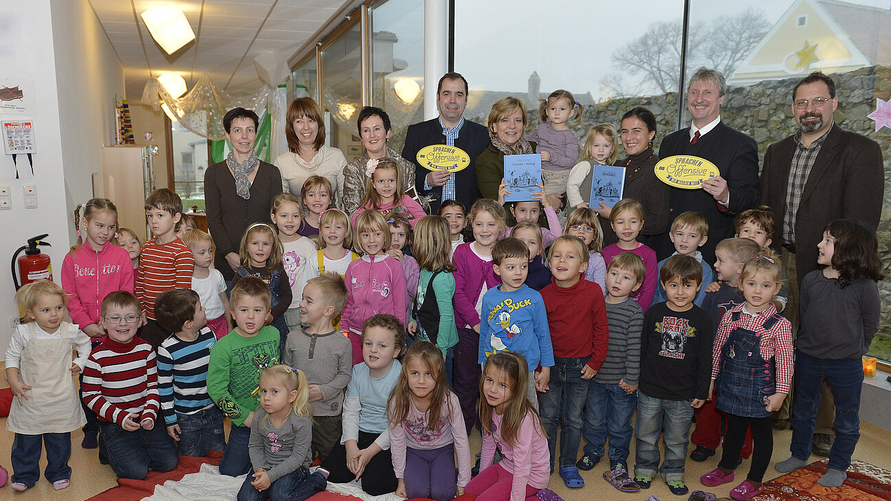 Der Kindergarten Wolfsthal ist bei seinen Bemühungen um die Vermittlung von ersten Slowakisch-Kenntnissen bereits im Kleinkinder-Alter besonders engagiert. Landesrätin Mag. Barbara Schwarz zeichnete den Kindergarten dafür mit der neuen Sprachenoffensive-Tafel aus: „In Grenzregionen sind die Chancen aber auch die Herausforderungen des Zusammenlebens größer. Grenzen markieren Trennungen, aber auch die Möglichkeit des Miteinanders. Verbindender Faktor und Grundvoraussetzung ist das Verstehen der Sprache des anderen. Es dient der Begegnung der Kulturen, dem Kennenlernen und Akzeptieren des anderen. Dieses Beispiel zeigt, wie Sprachkompetenz bereits im Kindergartenalter erworben werden kann. Dieses Projekt trägt damit ganz wesentlich zu einem Zusammenwachsen der Regionen bei.“