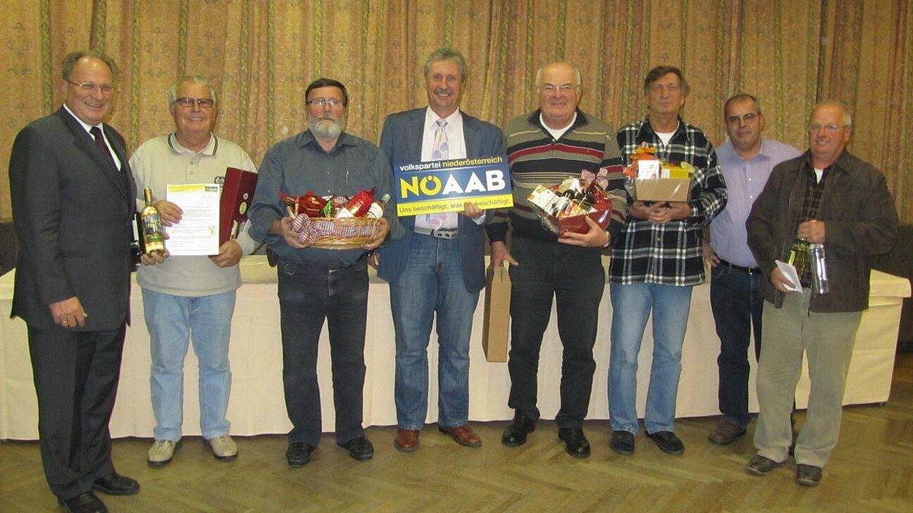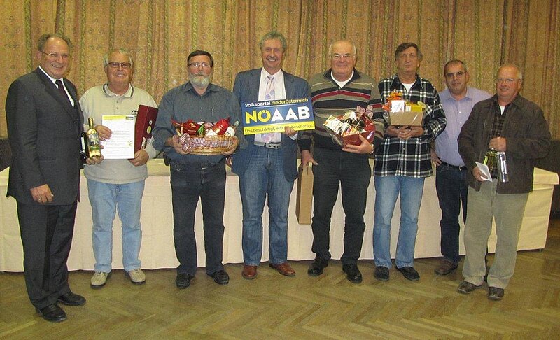 NÖAAB-Bezirksobmann Gerhard Schödinger und NÖAAB-Teilbezirksobmann Walter Bayer stellten am 25.10.2011 in der Ölmühle in Bruck/L ein tolles Bezirksschnapsen auf die Beine. Der Sieger des Turniers kommt aus Bruck/L (Josef Hofer, welcher für den NÖAAB-Stadtgruppenobmann Franz Wenzel eingesprungen war). Vizebürgermeister Rudolf Trakall (Gemeinde Scharndorf) sowie Karl Wagner (Sommerein) belegten die Plätze 2 und 3. Wir gratulieren den Gewinnern sehr herzlich. Auch an die nachfolgenden Plätze 4-8 gab es Preise und ein Dankeschön, welche von Bezirksobmann Schödinger überreicht wurden.