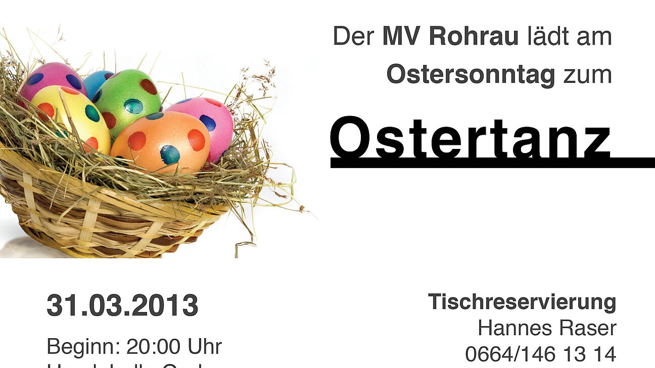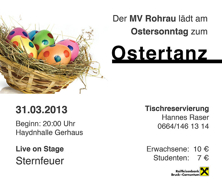 Der Musikverein Rohrau lädt am Ostersonntag, 31.03.2013 ab 20.00 Uhr in die Haydnhalle Gerhaus zum Ostertanz.