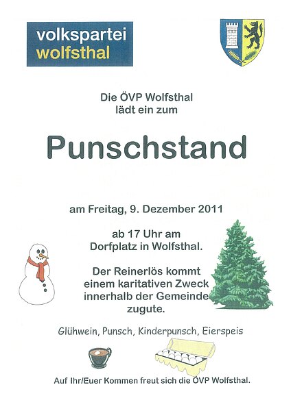 Die ÖVP Wolfsthal lädt am Freitag, 09. Dezember 2011 ab 17 Uhr am Dorfplatz in Wolfsthal zum Punschstand ein.
