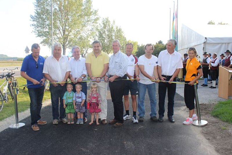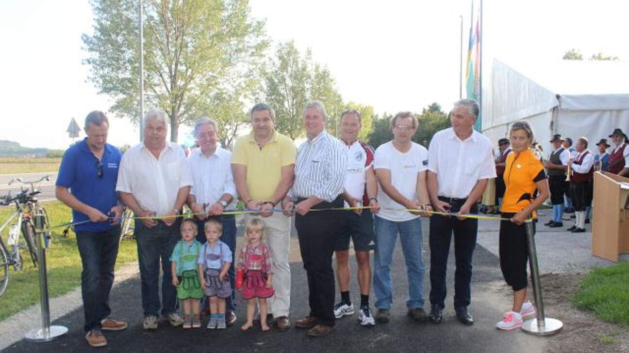 Bgm. Markus Plöchl (Enzersdorf) und Bgm. Thomas Ram (Fischamend) durften VP-Bundesrat Gerhard Schödinger, FP-Bundesrat Werner Herbert sowie Bgm. Leopold Winkler aus Kleinneusiedl, Planer Ziviling. DI Franz Paikl sowie das Team Radland bei der offiziellen Eröffnung des Radweges von Enzersdorf nach Fischamend am letzten Wochenende begrüßen.
