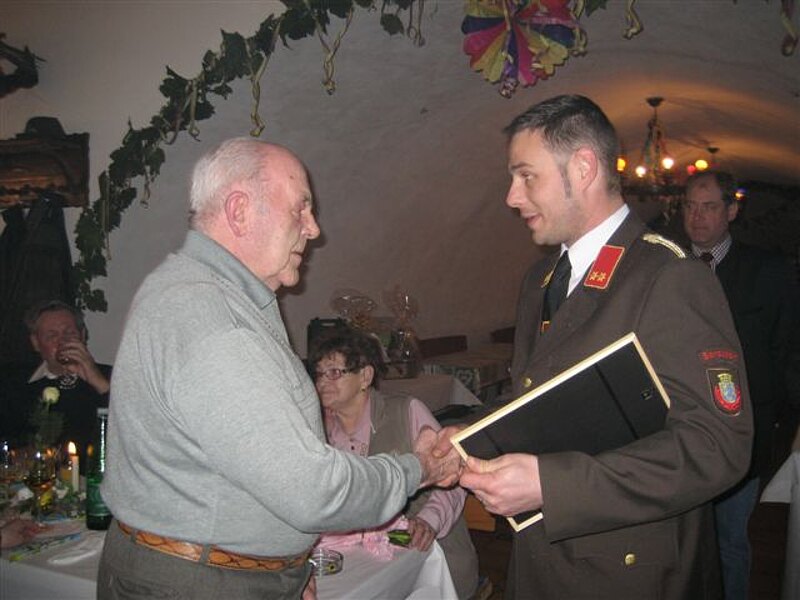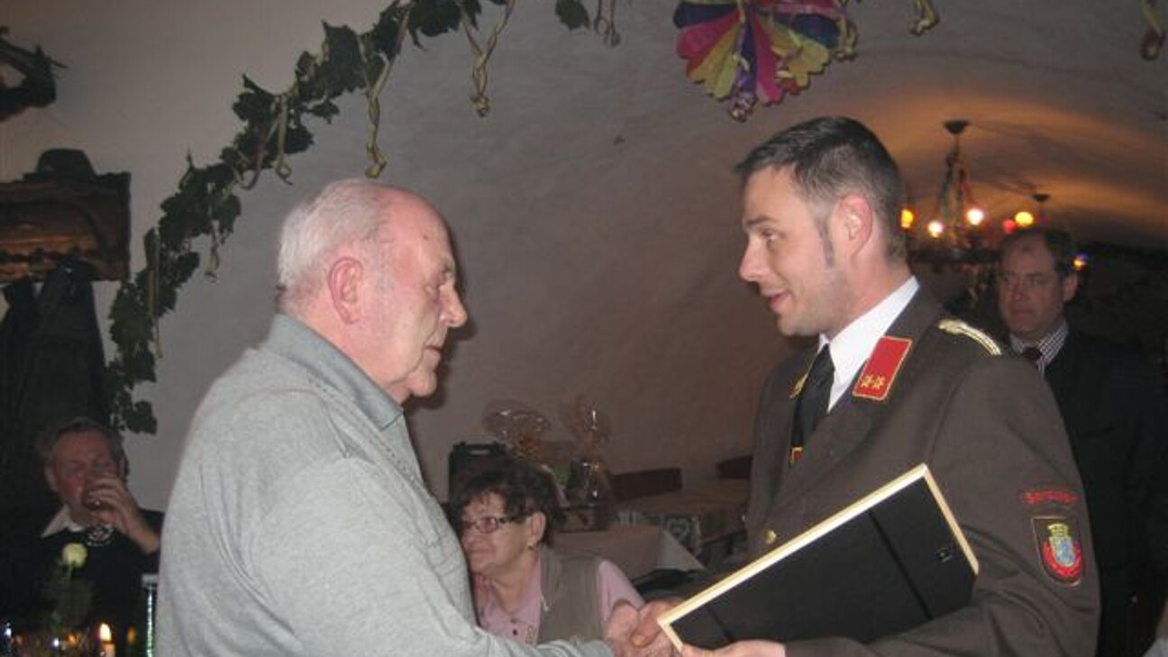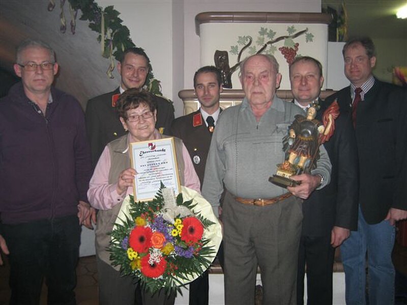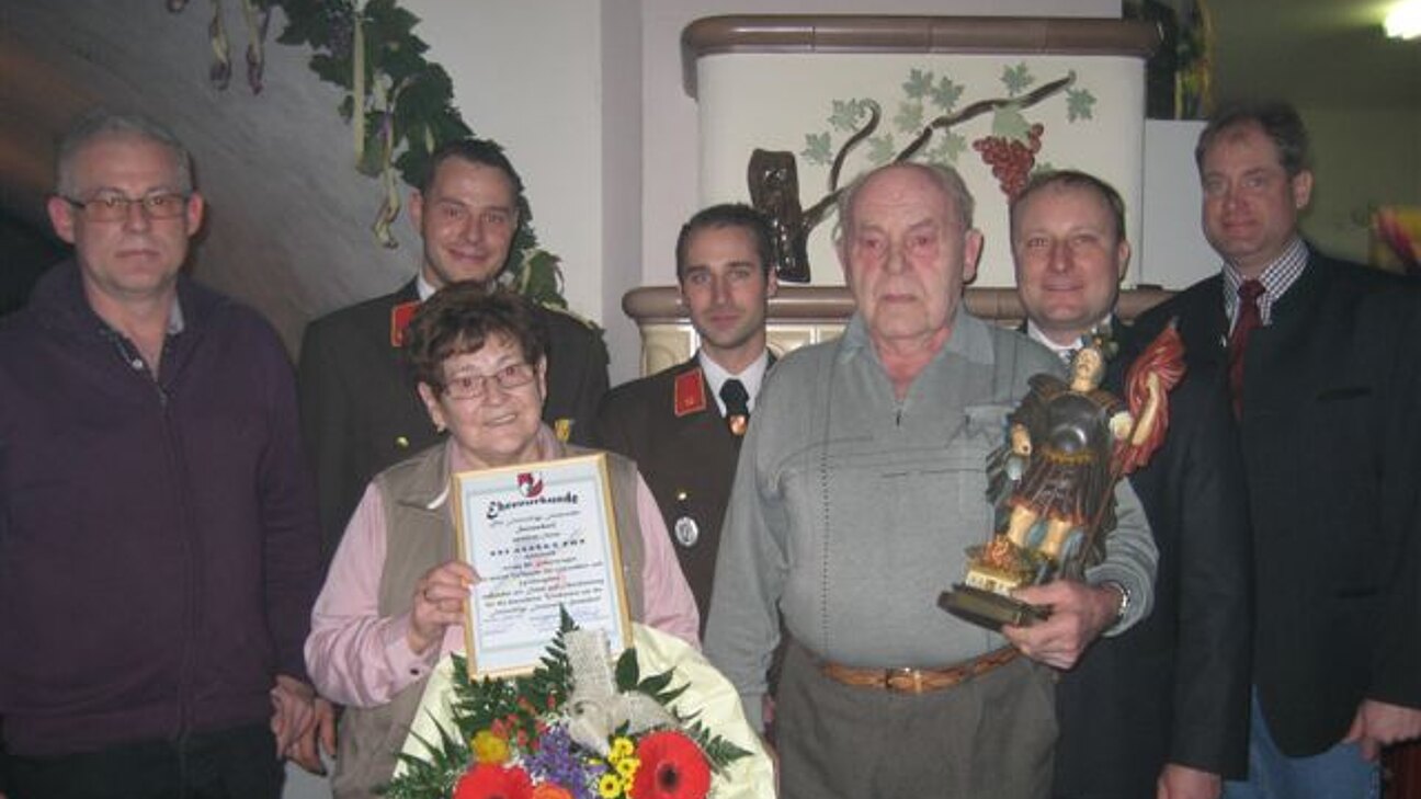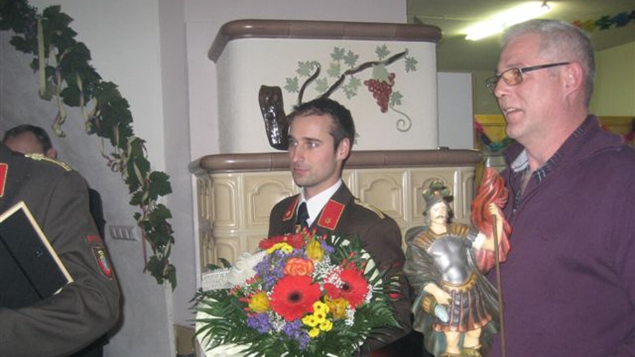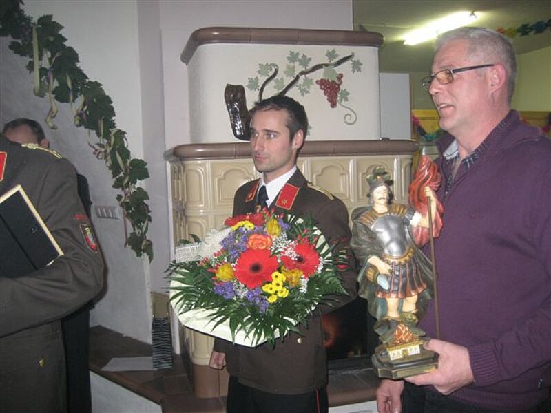 Von Feuerwehrkommandant Jochen Spitzhüttl und seinem Stellvertreter Robert Maranda gab es weiters eine Ehrenurkunde sowie eine Statue vom Hl. Florian für die jahrzehntelange Mitarbeit und Unterstützung bei der Feuerwehr Sarasdorf.