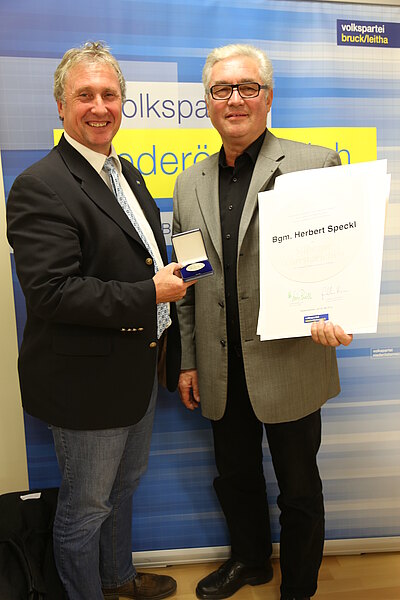 Bezirksparteiobmann Bundesrat Gerhard Schödinger überreichte gestern an Bürgermeister Herbert Speckl aus Rohrau für seine jahrelangen Verdienste und sein unermüdliches Engangement in der Gemeinde das Silberne Ehrenzeichen der VP NÖ, unterfertigt von LH Dr. Erwin Pröll und LGF Mag. Gerhard Karner.