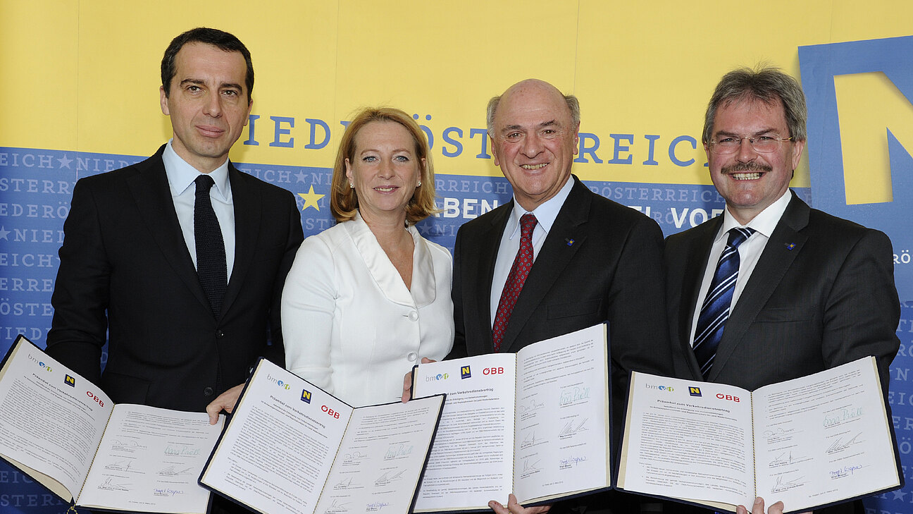Im Landhaus in St. Pölten kam es am 5. März zur Unterzeichnung des Verkehrsdienstvertrages für Niederösterreich durch Landeshauptmann Dr. Erwin Pröll, Bundesministerin Doris Bures, Landesrat Mag. Karl Wilfing und Mag. Christian Kern, den Vorstandsvorsitzenden der ÖBB. Der Vertrag regle das Angebot im Öffentlichen Verkehr in Niederösterreich bis zum Jahr 2019, informierte der Landeshauptmann in seiner Stellungnahme. Von den 24,5 Millionen Zugkilometern in Niederösterreich seien 23,1 Millionen durch den Bund und 1,4 Millionen durch das Land bestellt worden. Mehr Geld für öffentlichen Verkehr