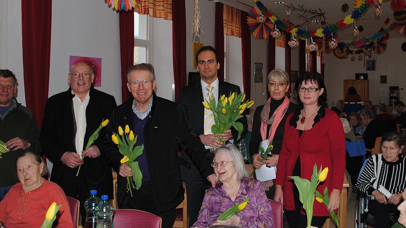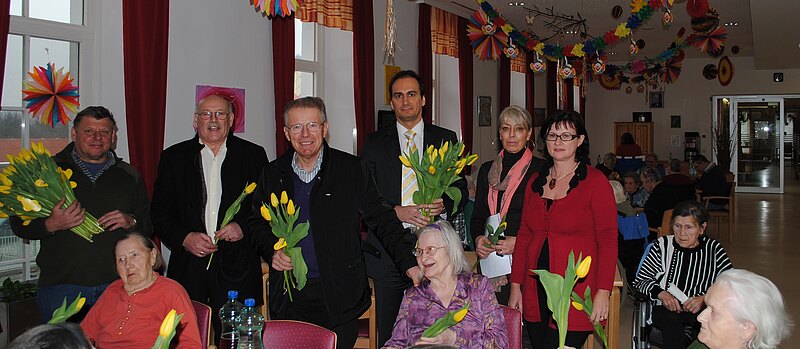 BPO Friedrich Hensler und Hainburgs Vizebürgermeister Josef Zeitelhofer verteilten anläßlich des Valentinstages gelbe Tulpen im Landespflegeheim Hainburg, worüber sich die Heiminsassen sehr freuten.