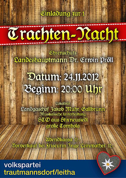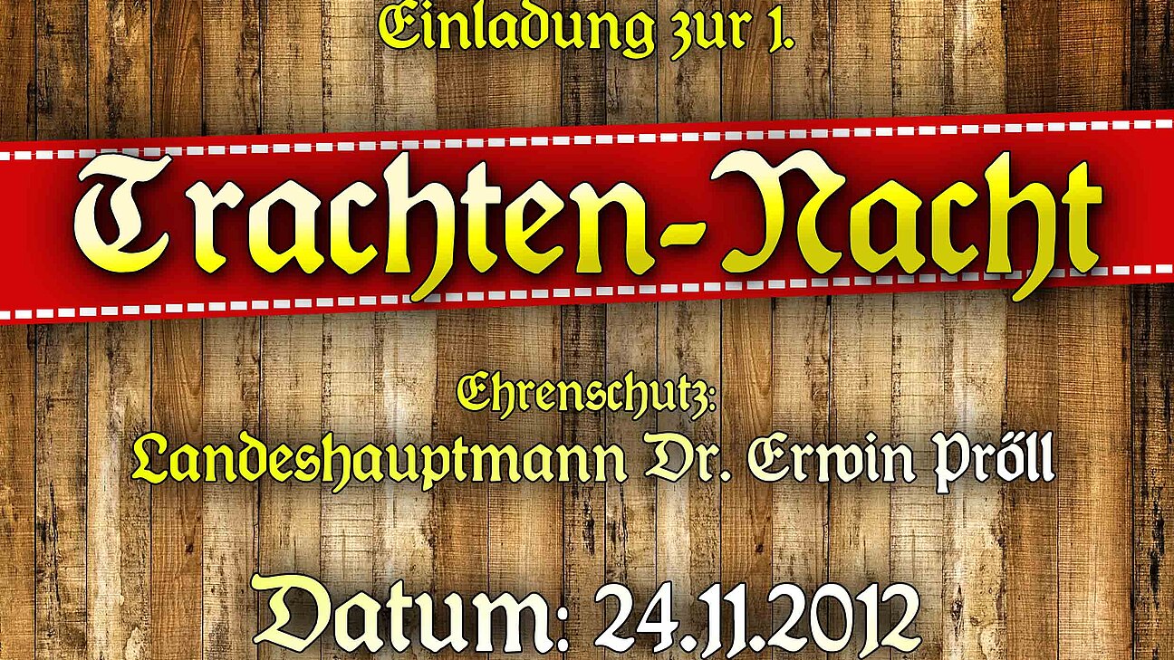 Am Samstag, den 24.11.2012 lädt die Volkspartei Trautmannsdorf zur 1. Trachten-Nacht in den Landgasthof Jakob Muhr. Den Ehrenschutz übernimmt Landeshauptmann Dr. Erwin Pröll.