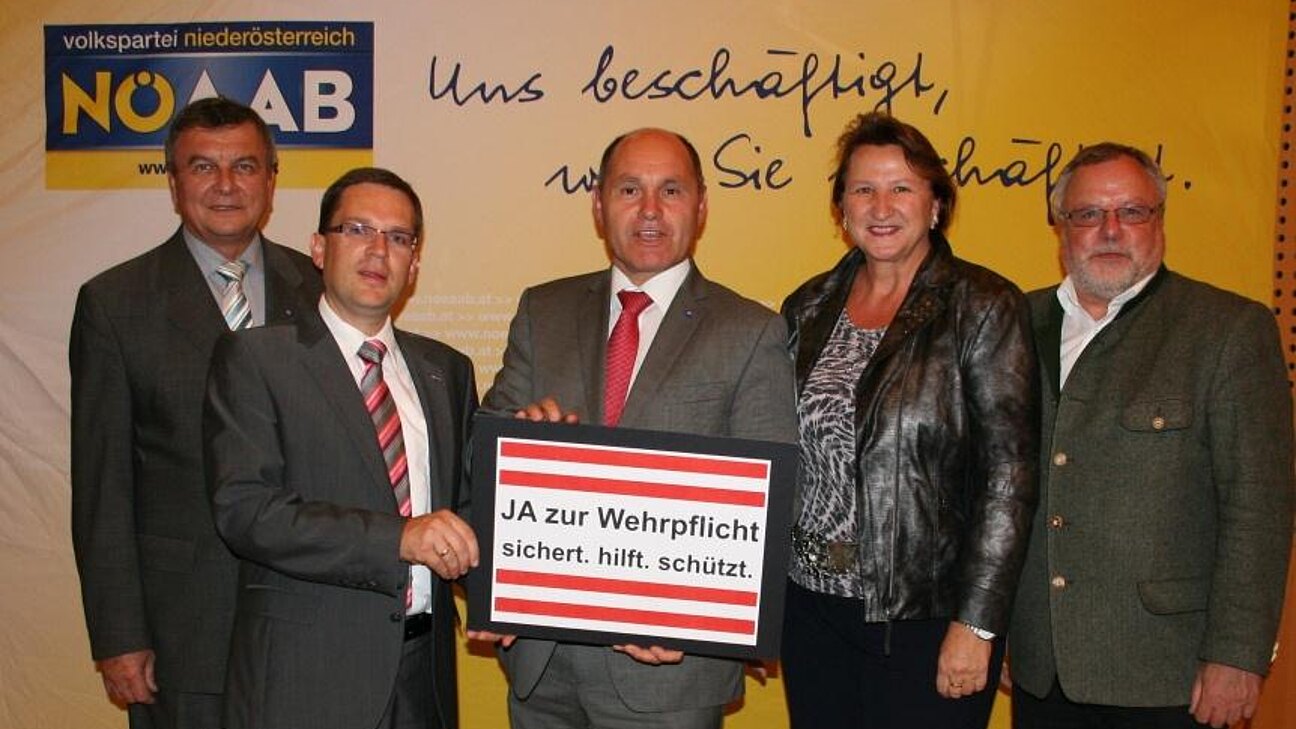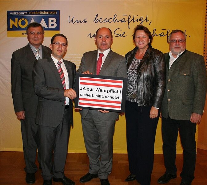 „Der NÖ Arbeitnehmerbund war die erste politische Organisation, die sich einstimmig hinter die Wehrpflicht gestellt hat. Noch vor Bekanntgabe einer Volksbefragung haben wir kräftig für die Wehrpflicht Stimmung gemacht. Jetzt bereiten wir uns auf den Endspurt vor, es geht vor allem um Unentschlossene bzw. darum die Menschen zur Stimmabgabe zu motivieren. Denn auch wenn viele ein klares Ergebnis in NÖ erwarten, bundesweit wird es eine ganz knappe Entscheidung“, weiß NÖAAB-Bezirksobmann-Stvtr. Christine Besser. Die Bezirksobmann-Stellvertreterin führt die drei zentralen Argumente an: „Im Katastrophenfall geht es um Mannstärke. Für das Berufsheer wird sich niemand finden, das haben die Pilotprojekte gezeigt. 110 Pionier-Soldaten wurden gesucht, 150.000 Leute wurden dafür angeschrieben, weniger al 90 hat man zusammengebracht. Das zweite Argument, der Zivildienst: Vom Krankentransport bis hin zum Kinderheim - Zivildiener sind aus der gesundheitlichen und sozialen Versorgung nicht mehr weg zu denken. Wie sollen Arbeitslose, die im Schnitt nur 3 Monate arbeitslos sind, diese Aufgabe ernsthaft bewältigen. Zum Dritten geht es um das Bundesheer selbst. Spanien, Großbritannien oder auch die USA rekrutieren sogar Vorbestrafte und Ausländer um ihre Reihen zu füllen – soweit darf es nicht kommen.“ Besser verweist auf die breite Unterstützung aller politischen Parteien im Bezirk: „Außerhalb von Wien gibt es auch in der SPÖ mehr Wehrpflicht-Befürworter als Gegner. Hier geht es nicht um rot gegen schwarz, hier geht es um einen Eckpfeiler unsere Gesellschaft“.