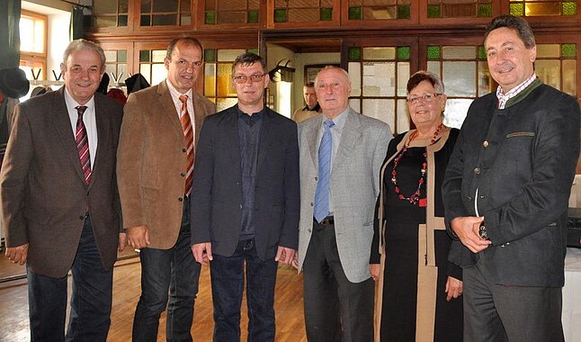 Ernst Hlavik aus Höflein feierte seinen 80. Geburtstag. SB-Obmann Franz Rupp, Bürgermeister Otto…