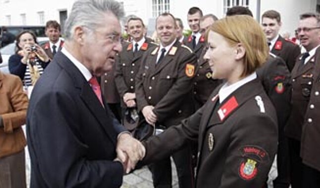 Ein Ehrenzug der Freiwilligen Feuerwehr empfing den Bundespräsidenten und Frau Margit Fischer in der…