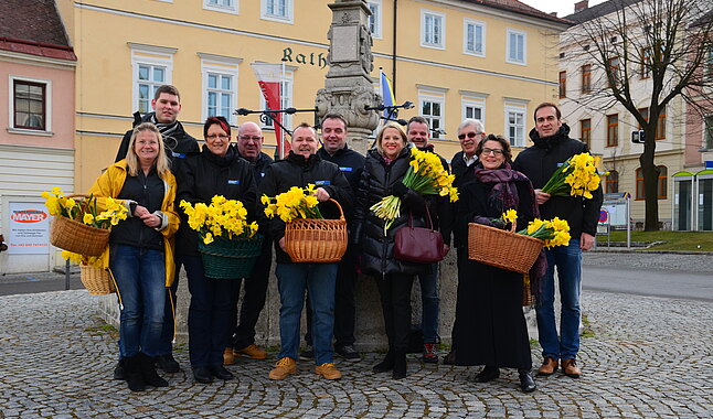 Das Team der VP-Stadtpartei Hainburg verteilte zum Valentin gelbe Narzissen an ihre Bürgerinnen und…